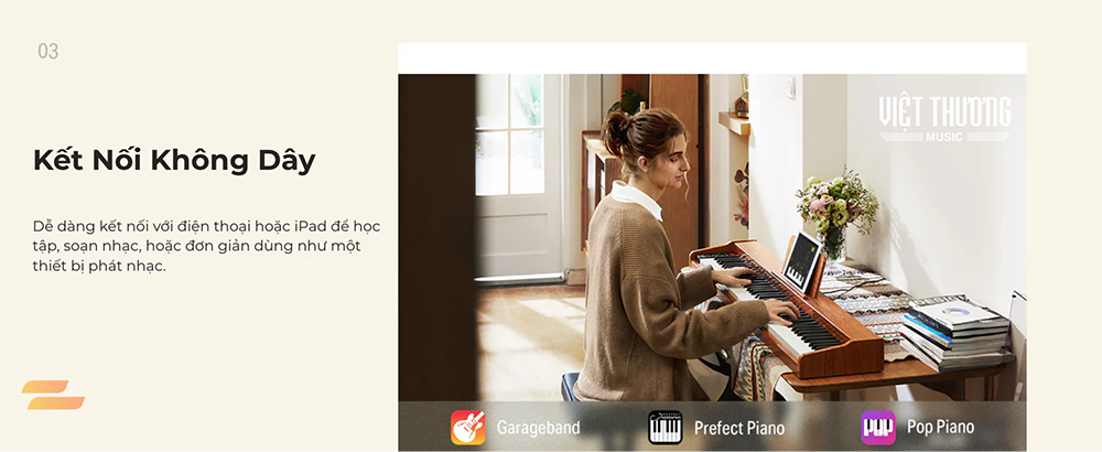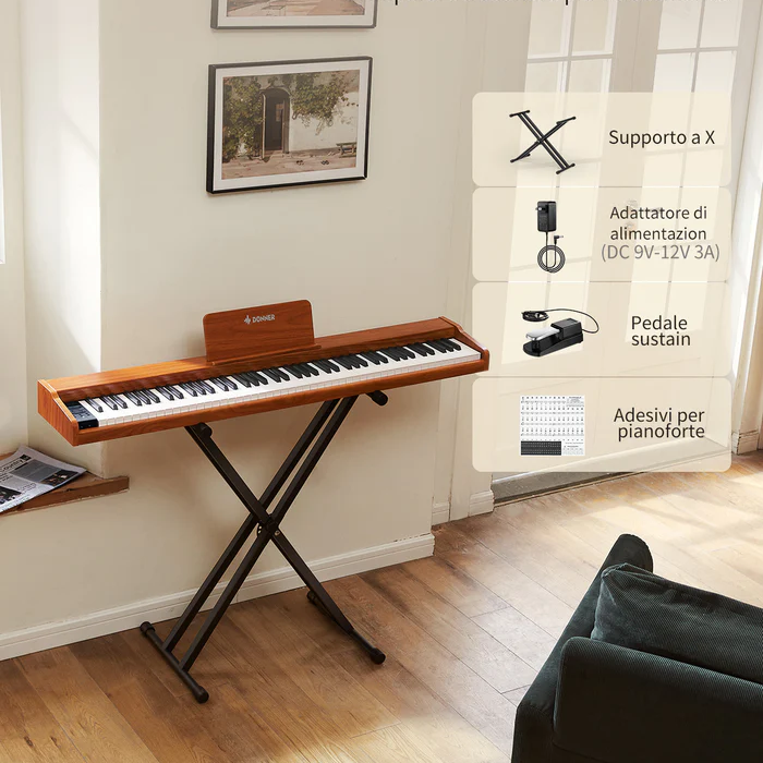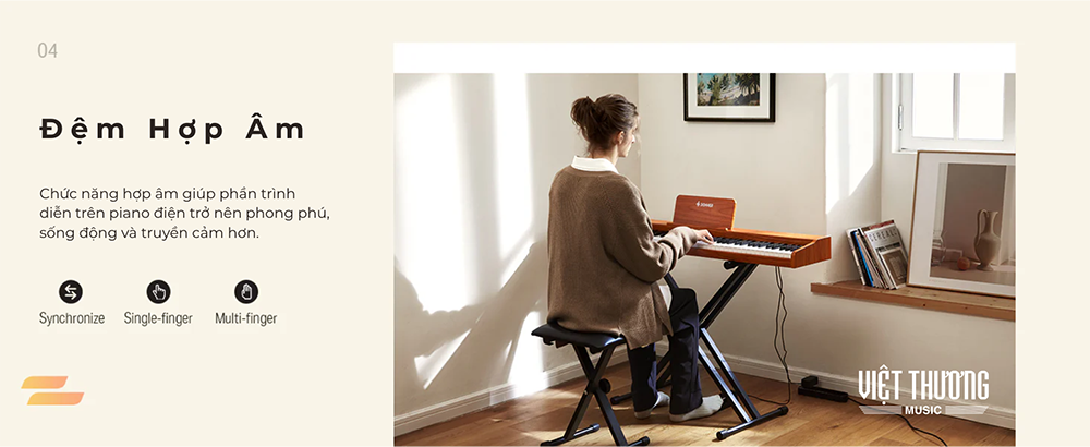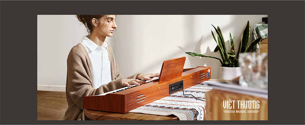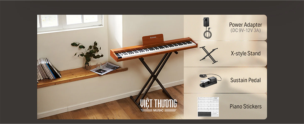 · Phụ kiện đầy đủ, thiết kế gọn đẹp: Bộ sản phẩm kèm theo chân đàn có thể điều chỉnh, pedal sustain và bộ nhãn dán phím giúp người mới dễ làm quen. Kiểu dáng gỗ retro tinh tế, gọn nhẹ, phù hợp cho cả gia đình và lớp học.