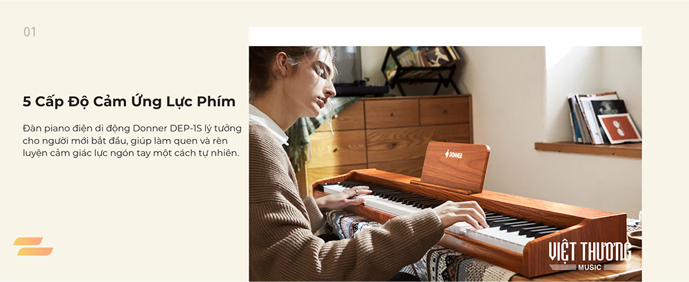 · Âm thanh chân thực, phím đàn nhạy: Donner DEP-1S có 88 phím đàn tiêu chuẩn, cảm ứng lực với 5 mức độ nhạy. Người chơi có thể bộc lộ cảm xúc qua từng nốt nhạc. Âm thanh được tái tạo giống piano cơ, giàu và tự nhiên.