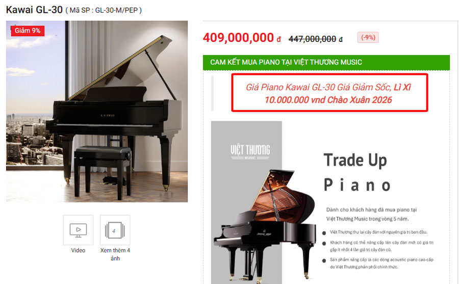 Trong chương trình ưu đãi cuối năm tại Việt Thương Music, giá đàn Kawai GL-30 được điều chỉnh hấp dẫn: